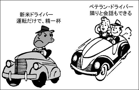 運転を例にしますと、ベテランのドライバーであれば、車がスムーズに走っている状況では、ラジオを聞きながら、あるいは同乗者とかなり込み入った会話をしながら、十分運転可能です。反対に、免許取りたての新米ドライバーでは、車を運転するだけで精一杯で、同乗者との会話などはとても無理です。つまり、新米のドライバーでは、注意を集中して、頭を使って一生懸命に運転しなければなりません。そのような状態では、運転だけで精一杯で、同時にほかのことをするなど、とても無理です。では、両者のこの差は、どこからくるのでしょうか?