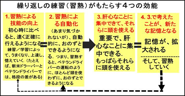 以下で、この点について、「繰り返しの練習(習熟)がもたらす4つの効能」の図式を参考にして、説明していこうと思います。