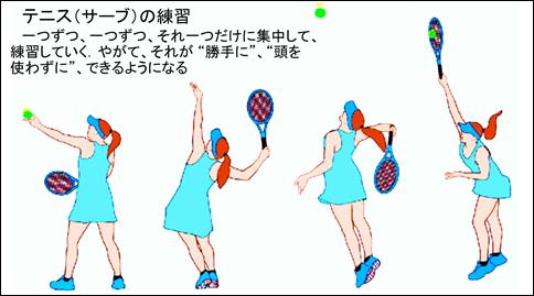 ・テニスの例:スポーツの場合でも、運転の場合と同じことが起こります。テニスのサーブでは、最初は、一つずつの動作について頭を使って、集中して練習をします(下のイラストを参照)。「ボールを少し高めに上げて、ラケットの面がボールと直角になるように振ろうとか、もっと力強く振ろうとか、フォローが大切だとか、すばやく振ろうとか、体の向きにもっと注意をしなければ、など」とかの、サーブ動作の各側面の一つずつに集中して、頭を使いながら、練習していきます。そういう練習を、繰り返していきますと、だんだんと上達していきます(1.)。でもそれだけではなくて、何度も何度も繰り返し練習していくと、すでに、運転や漢字の練習を例にして述べたように、やがて、色々なタイプのサーブを、頭で考えることなく、そうしようと思っただけで、“自動的に” できるようになります(2.)。