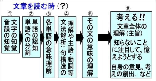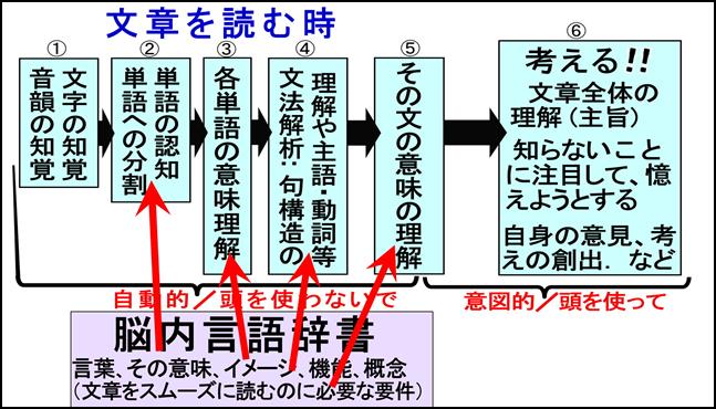 しかし、上記は正しくはありません。我々(学生や成人)では、日常的に読んでいる文章では、上で述べた過程(@〜D)などはまったく自覚なしに、スムーズに、そしてスピーディに読んでおられることでしょう。ご自身を振り返えっていただいて、あなたは上記の@〜Dまでの過程のところでいちいち考えて読んでおられますか? (無論、知らない漢字や単語が出てきた場合は別ですが)。普通に文章を読んでいる場合には、そんなこと(@〜C、D)には気づくことさえなく、読むと同時にその文の意味を理解されているのではないでしょうか。