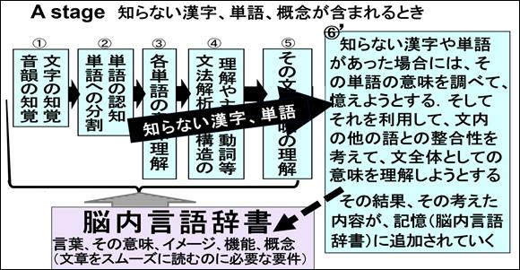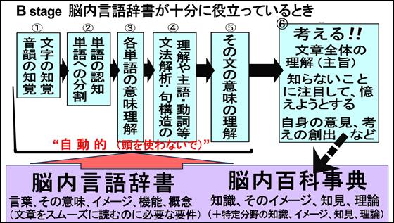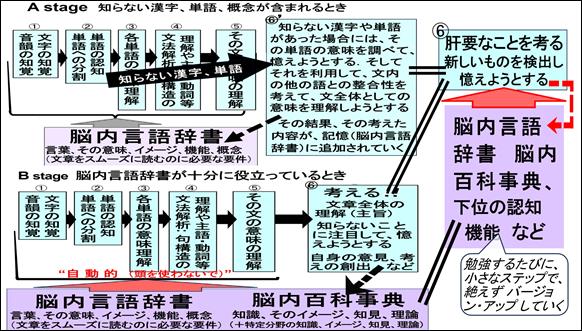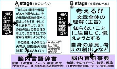 このようにして、その人の脳内言語辞書が、より高度な単語や概念を含むものに増補改訂されていくことでしょう。そのような増補改訂は、文章を読む能力を広げ、向上させ、進化させます。ですから、このA stageは、学校での勉強としてとても大事な過程なのです。