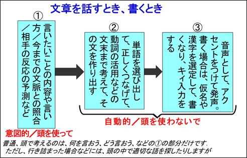 最後に、文章を書くとき、話すときも、自動化された下位技能に大いに助けられています。それどころか、それらがいわば勝手に働いてくれなければ、スムーズに書くことも、話すこともできないのです。我々は、まず言いたいことの内容を考えて、そして、大切なポイントを確認したり、全体の流れを考えたりしながら、文を書きます/話します。しかし、実際には、文字として書いていく(あるいは、音声として話していく)には、下の図式のようにまだまだなすべきことがたくさんあります。しかし、ほとんどそういうことは考えずに、(言い換えると、上のようなことだけを考えて)、書いたり、話したりしています。それは、それらの下位の認知作業(A、B)は、長い間の勉強/練習によって、頭を使わずに自動的にできるようになっているからできるのでしょう。ですから、我々は、自分は@だけをしていると思っているのです。あるいは、そうしていると思うことができるのです。