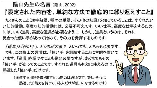 陰山自身も、「習熟した内容こそが次なるものを学習していくための『学習能力』となるのです」と述べています(岸本・蔭山, 20015))。まさしくその通りです。また、このように考えますと、陰山先生が小学生の子供たちに対して行ったことが、大学入試にまで,あるいは一生効力を発揮したことの謎が解けます。