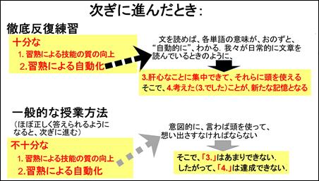他方、一般的な授業方法の後では、「2.習熟による自動化」が十分ではないので、そうやって習った単語について、「この単語の意味は確か○○だった」などと頭を使って想い出さないといけないことになるはずです、そうなると、その人は、その文章について考えること「3.」が十分にできないことになります。そのため、その文章の内容を憶えること「4.」があまりできないはずです。以上のように、徹底反復練習の後では、次ぎに進んだ課題(文章)から新しいことを憶えていくことが容易なのに対して、一般的な授業方法では、新しいことを憶えていくことがあまりうまくいかないことになります。以上のように、両勉強法の差は、次の勉強に進んだ特に、クリティカルな差を生じさせます。