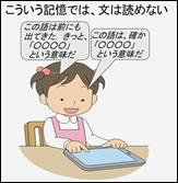 陰山メソッドでは、文章理解の基礎的過程である(@〜D)を、非常に多種類の文を用いて繰り返し、練習させることで、さまざまな文(文脈)の理解過程に習熟できるようにしています(たとえば、上の図のように、漢字を書く問題と読む問題に同じ文を用いています)。つまり、文単位の問題を繰り返し練習させて、文の理解(@→D)を、頭を使わずに自動的にできるようになることを目指しているのです。そうやって、その成果として、本人の能力を、本当の意味で文章を読むこと(E)に集中できるように準備しているのです。