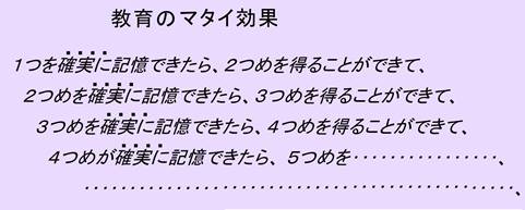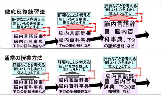 一般的な授業方法のあと:ところが、一般的な授業方法のあとでは、得られた脳内言語辞書や脳内百科事典から(上記の徹底反復練習のあとのような)良質な支えを得られないので、新しいものに集中することができないので、新しいものをうまく憶えていくことができない。せっかく勉強しても、それらの辞書や辞典をあまり向上させることができない。さらに、先に進んだときにも、徹底反復練習の後で手に入れた辞書や辞典に比べて、良質でない支えしか受けられないので、またもや、新しいものに集中することが難しく、効率よく勉強することができない。そのため、その新しいものをうまく憶えていくことができない。たとえて言うと、いつもその場限りの、利息の単利計算を繰り返しているようなものになるのではないでしょう。以上のように、徹底反復練習法と一般的な授業方法との差は、最初は小さいものかもしれないが、勉強が進んでいくにしたがって(学校や学年が上がっていくほど)、逆にその差はむしろ大きなものになっていくのではないでしょうか。
