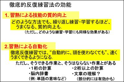 算数に関しては、ですから、徹底的反復練習法は小学校の低学年では本質的な有用性をもっています。しかし、それより上の段階については、たとえば公文式について、その塾では長年の実施経験によって、有用な方法論的を蓄積、馳駆されているとは存じますが、他の学習、練習方法と特段の優位性は持ち得ないように考えられます。皆様はいかが考えられるでしょうか。