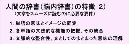 被検者(被検査者)に要求しているのは文を読み上げるということですが、日本語話者(日本語を母国語として日常的に使っている人)であれば、そのような場合には、その文の意味の理解(今までに述べてきた「文章を読むとき」の@〜Dの過程)を必然的に行うことになります(一般的に、文を見ると、我々は当然のこととしてその文の意味を理解しようとします。反対から言いますと、日常的な状況で、文を見ると、その文の意味を理解しようとせずにはおられません。後述する「備考」のところを参照)。そこで、被検者には、その文を口に出して読むこと(すなわち、理解すること)と、指示した語を記名して憶えておくという2種類の作業を平行して、してもらうことになります。
