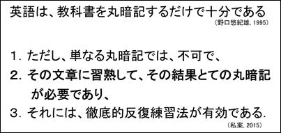 英語の学習においても、徹底的反復練習法による適切な課題を作ると、英語の学習に有効かもしれません。野口悠紀雄氏は、その著書「趙勉強法」の中で、英語の勉強には、「英語は教科書を丸暗記」することがいい方法であると述べておられます8)。これは、私には、本末を転倒した言葉のように思われます。いわゆる丸暗記(本質の理解は抜きにして、そっくりそのまま暗記すること)ではなくて、英語の文章(たとえば、教科書の文章)に習熟することで、その結果として、丸暗記できている状態になる、必要があるのではないでしょうか。野口氏は、丸暗記のやりかたとして、「教科書を二十回音読して、丸暗記せよ」と述べているが(意味もよくわからないものを丸暗記的に読んで何になるのだろうか?)、私は、英語の文章を色々な方向から触りながら自身で学習を繰り返すと、やがて丸暗記できる、それが必要な要件であると考えるのである。そう、生徒にしてもらえるには、(❺で例課題をご紹介する)英語文章の徹底的反復練習法が可能と考えているわけである。