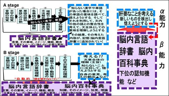 この2つの能力を便宜的に、α能力、β能力と名付けて、整理してみたいと存じます。一つめの「α能力」は、EやE’として示してきた、「その文や文章について意図的に考える、あるいは知らない単語について意図的に考える力で、そして、自分にとってまだ知らない知識や言葉などについて憶えようと努力をする」ことです。もう一つの「β能力」は、ひと言で言えば、「辞書的な記憶、知識」で、その主たる部分は、❷の最後のほうで、脳内言語辞書と脳内百科事典、および、“認知フレーム”であると述べました。
