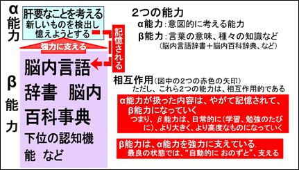 一つは、α能力で考えた、注目したものやこと(種々の知識、言葉の意味や概念、など)は、習得されて、β能力になっていきます。ですから、 β能力は、日常的に(学習、勉強のたびに)、より大きく、より高度なものに増補改訂されていきます。また、β能力はその本質的な機能として、α能力を支えています。それも、最良の状態では、我々が日常的に文章を読んでいるときに言葉の意味が難なく(自身でいちいちその意味を想い出しているのだと意識することなく)わかるように、β能力は“自動的に”、“おのずと”、α能力を支えます。