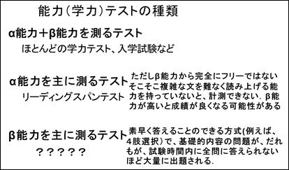 ここまでで述べてきた本試論を検証するには、どうしても両能力を別個に測定する必要があります。しかしながら、それはなかなか難しいことです。というのは、我々の知的な能力の検査法は、ほとんど例外なく、α能力+β能力(正確に言うと、β能力に支えられたα能力)の検査だからです。学校でのほとんどすべてのテスト、入学試験、資格試験などは、それらはすべてそうです。でも、2つだけ例外があります。少なくとも、α能力、β能力それぞれの能力だけの測定を目ざしたテスト方法が存在します。最後に、それらについて説明します。