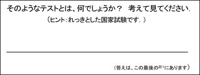 2) 完全に答えられることよりも、高速性を重んじるために、正答率よりも、どれだけたくさんできたかのほうを重視する。(具体的には、厳しい時間制限内にできた正答数で採点する。まず、100点満点を取れる者は、一人もいない、また、試験をするほうも、それを期待してはいないので、例えば、全問の80%以上正答であれば、それで合格とする)。